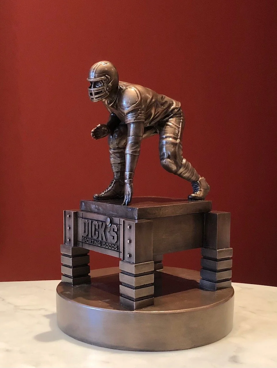 We were asked by the Chairman of Dick’s Sporting Goods to create a “Left Tackle” award to celebrate their highest level of performance. After researching the symbolism of this position, we created this award which captured the football symbolism and the store. We can use the same creativity and understanding your organization’s mission and history, to create unique awards.
